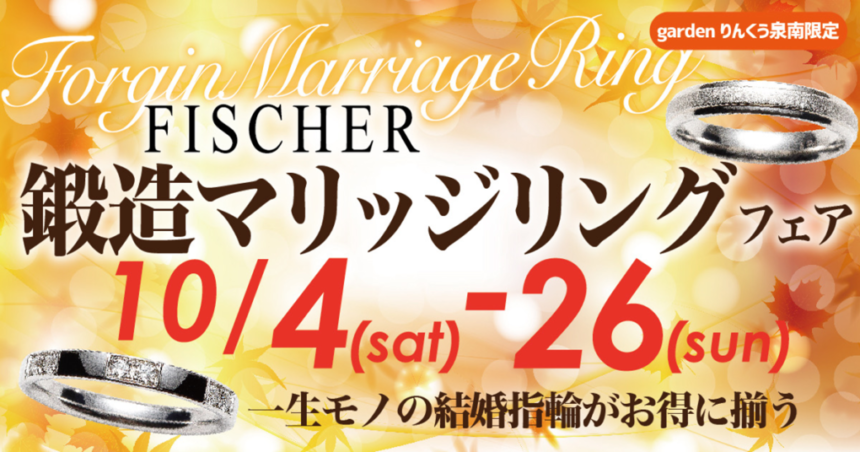 結婚指輪はずーと身に着けていたいアイテムジュエリーのひとつです。せっかくの結婚指輪だからこそ、一生使える強度と耐久性が選ぶポイントになります。鍛造製法で作られた強度と耐久性そこに美しさをプラスしたドイツの老舗ブランドFISCHER(フィッシャー)をgardenりんくう泉南/グレースフジミ泉南店がご紹介いたします。