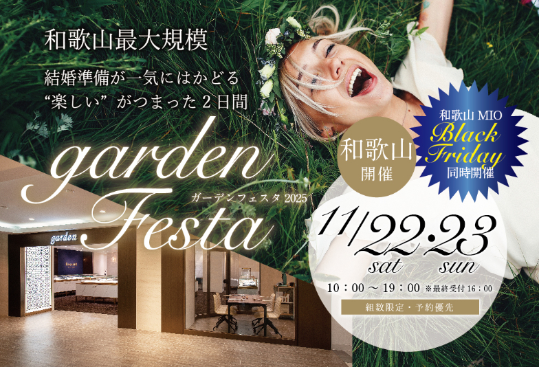 大阪・京都で毎回大好評のイベント、gardenフェスタ。garden和歌山でも11/22・23の2日間限定で開催!婚約指輪・結婚指輪選びはもちろんプロポーズ相談や結婚式場相談、フォトウェディング体験、ドレス選びに役立つ骨格診断など人気イベントが無料で体験可能!事前予約や当日成約特典も盛りだくさん!結婚準備が一気にはかどるお得なビッグイベントです。この機会を是非ご活用ください!