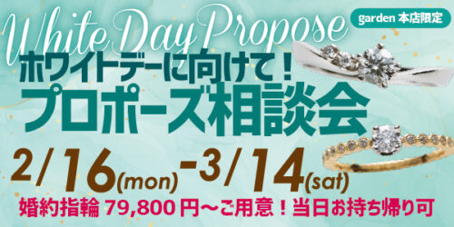 彼女から「YES」の返事をもらったら、これからずっと身に着けるリング(婚約指輪・エンゲージリング)のデザインを選びにご来店ください。当店では、豊富なリングのデザインをご用意していますので、ゆっくり店頭でお選びいただけます。リングをお決めいただいてから、6週間ほどお時間をいただきます。*お急ぎの場合は、gardenスタッフにご相談ください。