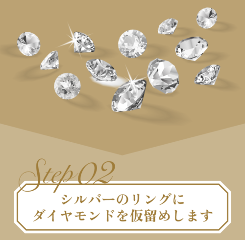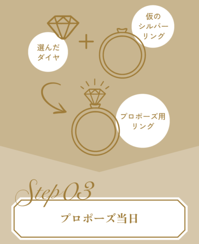 プロポーズ前にダイヤモンドをお選びいただきプロポーズ用のシルバーリングに仮留め。プロポーズ後に恋人とご来店いただいた際に、お気に入りのデザインの枠を選んでいただくというプロポーズ方法です。